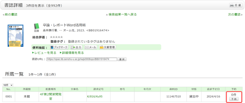 図書資料の予約や取り寄せをするには、書誌詳細画面で「予約」ボタンをクリックしてください。