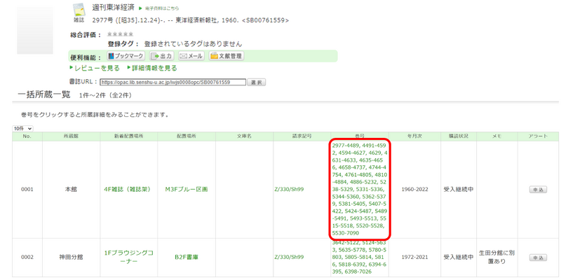一括所蔵一覧には、資料が置かれている場所や巻号、年月次などが表示されます。