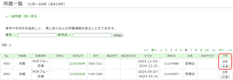 「所蔵一覧」から利用したい巻号の「予約」ボタンをクリックします。