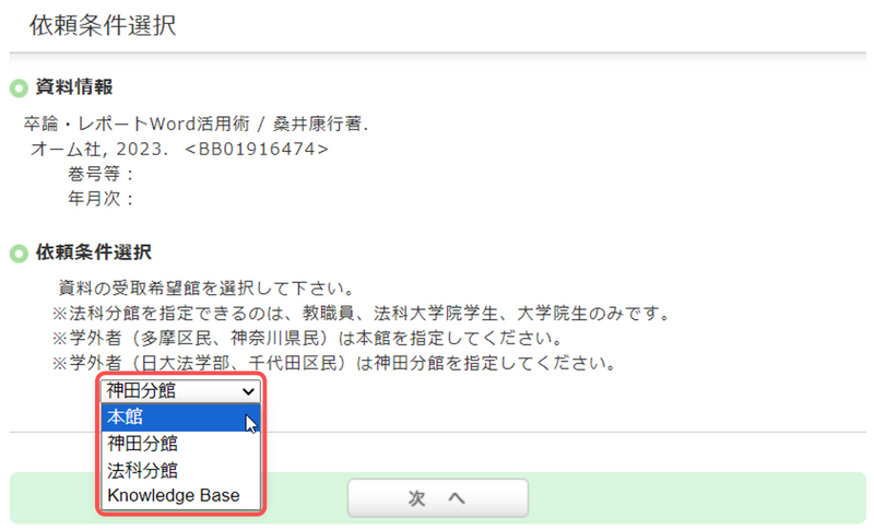 依頼条件選択画面が表示されるので、資料を受取りたい図書館を選択し、「次へ」ボタンをクリックします。