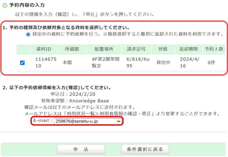 予約資料とメールの送付先を選択し申込ボタンをクリックします。