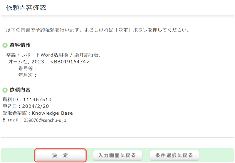 依頼内容確認画面で「決定」ボタンをクリックすると予約完了です。
